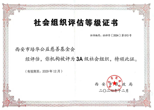 会上,西安市民政局社会组织管理局杨国平局长宣读“2024年西安市社会组织等级评估《文件》”,西安市培华公益慈善基金会荣获 3 A 级社会组织。