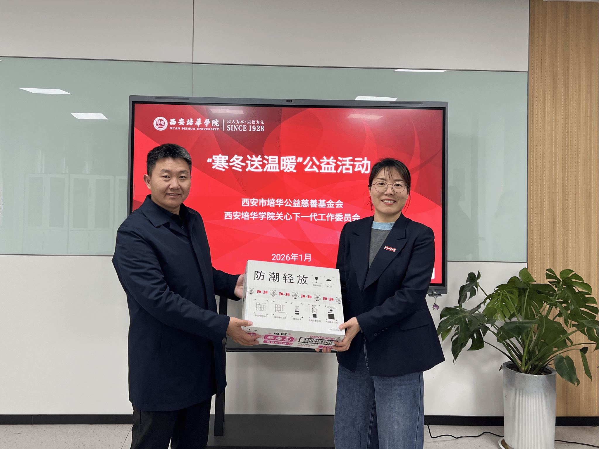 基金会工作人员对捐赠物资进行细致清点登记后,妥善入库保管。为尽快将这份温暖送达学子手中,1月12日,西安市培华公益慈善基金会联合西安培华学院关心下一代工作委员会(以下简称“关工委”)开展“寒冬送温暖”物资分发活动,将凝聚着多方爱心的物资精准送到留校学子身边,让同学们在实习期间深切感受到家的温暖与校园的关怀。